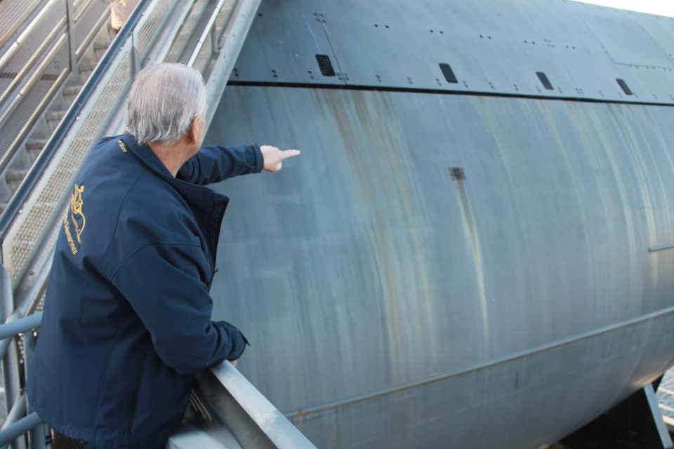 Ik stond op de boot, deze lag nog in het dok in Rotterdam. Wel in het water, maar heel hoog. De batterijen, dat waren er wel 335, van zo’n 500 kg per stuk, moesten er nog in. Ik had wacht en kreeg de opdracht om het potje te blazen – dat is de septic tank (met afvalwater dat onder andere afkomstig is van de toiletten). Deze moest in één keer worden leeggeblazen. Jan Doze